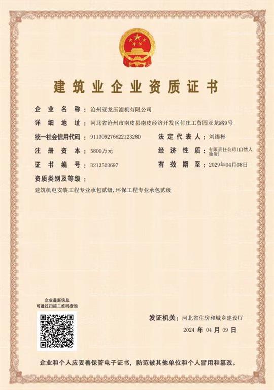 該資質(zhì)承攬內(nèi)容: 建筑機電安裝工程承包貳級,環(huán)保工程承包貳級。